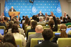(250916) -- NACIONES UNIDAS, 16 septiembre, 2025 (Xinhua) -- El secretario general de la ONU, António Guterres (d-atrás), sostiene una conferencia de prensa en la sede de la ONU, en Nueva York, el 16 de septiembre de 2025. Guterres indicó el martes que las iniciativas globales propuestas por China son totalmente compatibles con la Carta de las Naciones Unidas. (Xinhua/Xie E) (jg) (ra) (ce)