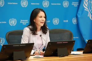(250917) -- NACIONES UNIDAS, 17 septiembre, 2025 (Xinhua) -- Annalena Baerbock, presidenta del 80° período de sesiones de la Asamblea General de las Naciones Unidas (AGNU), habla con la prensa en la sede de la ONU, en Nueva York, el 17 de septiembre de 2025. El 80° período de sesiones de la AGNU se centrará en temas como el avance de la agenda de reformas ONU80, la orientación del proceso de selección del próximo secretario general de la ONU y la recuperación del impulso de los Objetivos de Desarrollo Sostenible, dijo Baerbock el miércoles. (Xinhua/Xie E) (jg) (da) (vf)