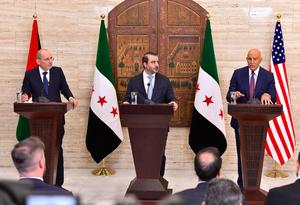 (250916) -- DAMASCO, 16 septiembre, 2025 (Xinhua) -- El jefe para Asuntos Exteriores de las autoridades sirias, Assad Hassan al-Shibani (c), el ministro de Relaciones Exteriores jordano, Ayman Safadi (i), y el enviado especial estadounidense para Siria, Thomas Barrack (d), asisten a una conferencia de prensa conjunta, en Damasco, Siria, el 16 de septiembre de 2025. Las autoridades sirias dieron a conocer el martes una hoja de ruta de siete puntos para abordar la crisis que se extiende durante meses en la provincia sureña de Sweida. (Xinhua/Ammar Safarjalani) (jg) (ra) (vf)