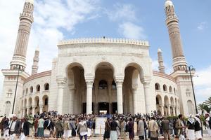 (250917) -- SANA, 17 septiembre, 2025 (Xinhua) -- Imagen del 16 de septiembre de 2025 de personas reuniéndose para participar en una ceremonia fúnebre para periodistas, quienes fueron asesinados por los ataques aéreos israelíes, en Saná, Yemen. (Xinhua/Mohammed Mohammed) (ah) (ce)
