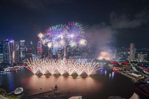 (250810) -- SINGAPUR, 10 agosto, 2025 (Xinhua) -- Imagen del 9 de agosto de 2025 de fuegos artificiales iluminando el cielo sobre Marina Bay durante las celebraciones del Día Nacional, en Singapur. Singapur celebró el sábado el 60 aniversario de su independencia. (Xinhua/Then Chih Wey) (oa) (da)