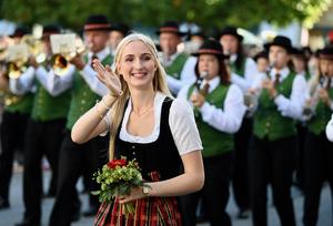 (250921) -- MUNICH, 21 septiembre, 2025 (Xinhua) -- Una mujer saluda a la audiencia durante el desfile del Oktoberfest, en Múnich, Alemania, el 21 de septiembre de 2025. El 190 Oktoberfest, uno de los más grandes festivales folclóricos de Alemania, se inauguró el sábado en Múnich, con el alcalde Dieter Reiter abriendo el primer barril de cerveza como marca la tradición. El festival de este año durará hasta el 5 de octubre. (Xinhua/Zhang Haofu) (rtg) (ah)