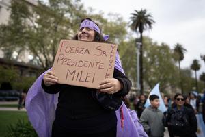 (250921) -- BUENOS AIRES, 21 septiembre, 2025 (Xinhua) -- Una mujer sostiene un cartel durante una manifestación en apoyo al Gobierno del presidente argentino, Javier Milei, en la Plaza de Mayo, en la ciudad de Buenos Aires, capital de Argentina, el 21 de septiembre de 2025. (Xinhua/Martín Zabala) (mz) (rtg) (ah)