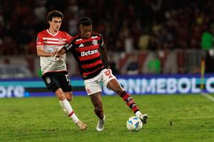 (250919) — RIO DE JANEIRO, 19 septiembre, 2025 (Xinhua) — Imagen del 18 de septiembre de 2025 del jugador Bruno Henrique (d), de Flamengo de Brasil, disputando el balón con Gastón Benedetti (i), de Estudiantes de Argentina, durante el partido de ida correspondiente a los cuartos de final de la Copa Conmebol Libertadores, celebrado en el Estadio Maracaná, en Río de Janeiro, Brasil. (Xinhua/Claudia Martini) (cm) (rtg) (ra) (vf)