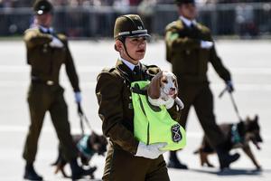 (250919) -- SANTIAGO, 19 septiembre, 2025 (Xinhua) -- Una carabinera carga a un binomio canino mientras participa durante la Gran Parada Militar en conmemoración del Día de las Glorias del Ejército, en Santiago, capital de Chile, el 19 de septiembre de 2025. (Xinhua/Jorge Villegas) (jv) (rtg) (ra) (vf)