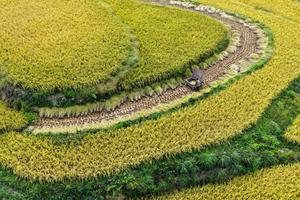 (250918) — CHONGQING, 18 septiembre, 2025 (Xinhua) — Vista aérea tomada con un dron el 18 de septiembre de 2025 de un agricultor trabajando en un campo de arroz, en el poblado de Wuli, en el distrito de Qianjiang, en la municipalidad de Chongqing, en el suroeste de China. El poblado de Wuli de Chongqing, que alberga aproximadamente 5.300 mu (cerca de 353,33 hectáreas) de arrozales, recientemente ha entrado a la temporada de cosecha de arroz. (Xinhua/Tang Yi) (rtg) (ra)