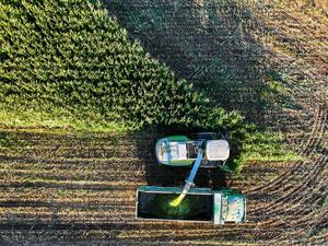 (250918) — TONGLIAO, 18 septiembre, 2025 (Xinhua) — Imagen aérea tomada con un dron el 18 de septiembre de 2025 de una cosechadora trabajando en un campo de maíz, en el poblado de Jurihe, en la bandera de Jarud, en la ciudad de Tongliao, en la región autónoma de Mongolia Interior, en el norte de China. (Xinhua/Lian Zhen) (da) (ra) (vf)