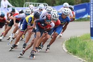 (250919) -- QINHUANGDAO, 19 septiembre, 2025 (Xinhua) -- Gabriel Reyes (frente), de Chile, compite durante la final masculina junior por eliminación de 15000m en el Campeonato Mundial de Patinaje de Velocidad en Ruta 2025, en el distrito de Beidaihe de Qinhuangdao, en la provincia de Hebei, en el norte de China, el 19 de septiembre de 2025. (Xinhua/Yang Shiyao) (oa) (ra) (vf)