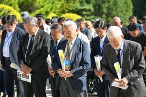 (250919) -- TIANJIN, 19 septiembre, 2025 (Xinhua) -- Imagen del 18 de septiembre de 2025 de personas permaneciendo en silencio en un parque memorial para conmemorar el levantamiento de Hanaoka, en la municipalidad de Tianjin, en el norte de China. Casi 150 chinos y japoneses se reunieron el jueves en la municipalidad de Tianjin, en el norte de China, para conmemorar el 80 aniversario del levantamiento de trabajadores forzados chinos en Japón durante la Segunda Guerra Mundial. (Xinhua/Sun Fanyue) (rtg) (ra) (vf)