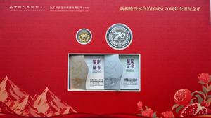 (250919) -- URUMQI, 19 septiembre, 2025 (Xinhua) -- Imagen del 19 de septiembre de 2025 de un conjunto de monedas conmemorativas con motivo del 70º aniversario de la fundación de la región autónoma uygur de Xinjiang. El Banco Popular de China emitió el viernes un conjunto de monedas conmemorativas de oro y plata como homenaje por el 70º aniversario de la fundación de la región autónoma uygur de Xinjiang, en el noroeste de China. (Xinhua/Ding Lei) (jg) (da) (vf)