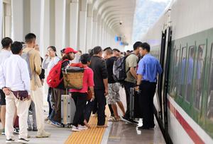 (250921) -- PU'ER, 21 septiembre, 2025 (Xinhua) -- Imagen del 20 de septiembre de 2025 de pasajeros abordando un tren en la Estación de Ferrocarriles de Pu'er, en la ciudad de Pu'er, en la provincia de Yunnan, en el suroeste de China. Hasta el 20 de septiembre, el ferrocarril China-Laos ha transportado a más de 59 millones de pasajeros desde su inauguración en diciembre de 2021, de acuerdo con China Railway Kunming Group Co., Ltd. (Xinhua/Xing Guangli) (rtg) (ah)