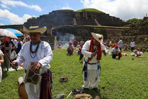 (250921) -- SANTA ANA, 21 septiembre, 2025 (Xinhua) -- Personas realizan una danza con música de tambores y flautas, durante una ceremonia maya en celebración por el equinoccio de otoño, en el Parque Arqueológico Tazumal, en el municipio de Chalchuapa, en el departamento de Santa Ana, El Salvador, el 21 de septiembre de 2025. (Xinhua/Alexander Peña) (ap) (rtg) (ah)