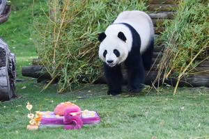(250921) -- MADRID, 21 septiembre, 2025 (Xinhua) -- Imagen del 20 de septiembre de 2025 del panda gigante Jin Xi acercándose a su almuerzo de cumpleaños en el Zoo Aquarium de Madrid, en Madrid, España. El zoológico celebró el sábado una serie de actividades culturales y educativas, entre ellas presentaciones acrobáticas, para celebrar el quinto cumpleaños de dos pandas gigantes. El macho Jin Xi y la hembra Zhu Yu, ambos nacidos en 2020, llegaron al zoológico el 29 de abril del año pasado. (Xinhua/Gustavo Valiente) (oa) (ah)