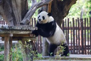 (250921) -- MADRID, 21 septiembre, 2025 (Xinhua) -- Imagen del 20 de septiembre de 2025 del panda gigante Jin Xi jugando en el Zoo Aquarium de Madrid, en Madrid, España. El zoológico celebró el sábado una serie de actividades culturales y educativas, entre ellas presentaciones acrobáticas, para celebrar el quinto cumpleaños de dos pandas gigantes. El macho Jin Xi y la hembra Zhu Yu, ambos nacidos en 2020, llegaron al zoológico el 29 de abril del año pasado. (Xinhua/Gustavo Valiente) (oa) (ah)