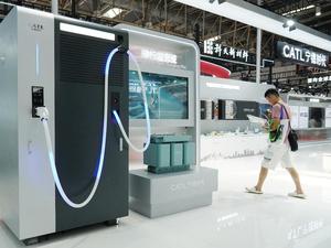(250720) -- BEIJING, July 20, 2025 (Xinhua) -- A Shenxing ultra-fast charging pile is pictured at the booth of Contemporary Amperex Technology (CATL) in the Smart Vehicle Chain area of the third China International Supply Chain Expo (CISCE) in Beijing, capital of China, July 18, 2025. At the Smart Vehicle Chain area of the third CISCE, more than 30 domestic and foreign enterprises and institutions showcased key technologies and products of the EV industry chain, demonstrating the achievements of the collaborative innovation in the sector. In addition to the Smart Vehicle Chain area, the Advanced Manufacturing Chain area and the Digital Technology Chain area also featured products and technological applications related to the EV industry. (Xinhua/Zhang Chenlin)
