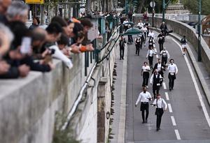 (250921) -- PARIS, 21 septiembre, 2025 (Xinhua) -- Meseros y meseras portan su uniforme de trabajo mientras participan en la tradicional "Course des cafes" (carrera de cafeterías), en París, Francia, el 21 de septiembre de 2025. La tradicional "Course des cafes", una carrera de 4 kilómetros en la que los competidores cargan una charola con agua, una taza de café y un croissant, se llevó a cabo en el centro de París el domingo. (Xinhua/Gao Jing) (rtg) (ah)