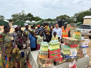 (250921) -- ACRA, 21 septiembre, 2025 (Xinhua) -- Imagen del 16 de septiembre de 2025 de residentes afectados por el conflicto recolectando suministros de ayuda donados por las comunidades chinas en Ghana, en la región de Sabana, Ghana. Las comunidades chinas en Ghana han donado suministros de ayuda con valor de más de 2 millones de cedis (aproximadamente 163.000 dólares estadounidenses) para las víctimas del reciente conflicto violento en la región de Sabana del país. (Xinhua/Greenhouse International Development Group Ghana Limited) (rtg) (ah)