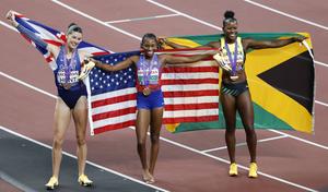 (250919) -- TOKIO, 19 septiembre, 2025 (Xinhua) -- Melissa Jefferson-Wooden (c), de Estados Unidos, Amy Hunt (i), de Reino Unido, y Shericka Jackson, de Jamaica, festejan al término de la final de los 200m femeninos en el Campeonato Mundial de Atletismo 2025, en Tokio, Japón, el 19 de septiembre de 2025. (Xinhua/Wang Lili) (oa) (vf)