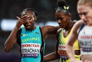(250918) -- TOKIO, 18 septiembre, 2025 (Xinhua) -- Shericka Jackson (d), de Jamaica, ayuda a Anthonique Strachan, de Bahamas, al término de la semifinal de 200m femeninos, en el Campeonato Mundial de Atletismo 2025, en Tokio, Japón, el 18 de septiembre de 2025. (Xinhua/Jiang Han) (da) (ra) (ce)