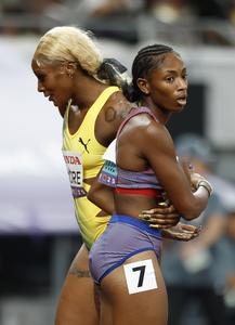 (250918) -- TOKIO, 18 septiembre, 2025 (Xinhua) -- Melissa Jefferson-Wooden (d), de Estados Unidos, y Ashanti Moore, de Jamaica, son vistas al término de la semifinal de 200m femeninos, en el Campeonato Mundial de Atletismo 2025, en Tokio, Japón, el 18 de septiembre de 2025. (Xinhua/Wang Lili) (da) (ra) (ce)