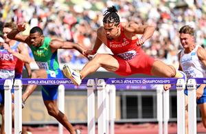 (250921) -- TOKIO, 21 septiembre, 2025 (Xinhua) -- Ayden Owens-Delerme (frente), de Puerto Rico, compite durante la prueba de 110m con vallas del decatlón masculino en el Campeonato Mundial de Atletismo 2025, en Tokio, Japón, el 21 de septiembre de 2025. (Xinhua/Song Yanhua) (oa) (ah)