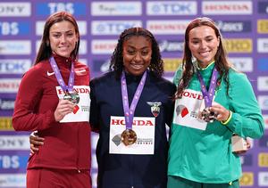 (250921) -- TOKIO, 21 septiembre, 2025 (Xinhua) -- La medallista de oro, Juleisy Angulo (c), de Ecuador, la medallista de plata, Anete Sietina (i), de Letonia, y la medallista de bronce, Mackenzie Little, de Australia, posan durante la ceremonia de premiación de lanzamiento de jabalina femenino en el Campeonato Mundial de Atletismo 2025, en Tokio, Japón, el 21 de septiembre de 2025. (Xinhua/Jia Haocheng) (oa) (ah)
