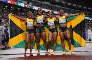 (250921) -- TOKIO, 21 septiembre, 2025 (Xinhua) -- El equipo de Jamaica, medallista de plata, festeja al término de la final de relevos 4x100m femeninos en el Campeonato Mundial de Atletismo 2025, en Tokio, Japón, el 21 de septiembre de 2025. (Xinhua/Ju Huanzong) (rtg) (ah)