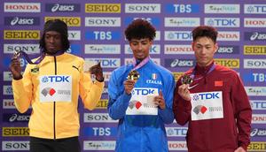 (250918) — TOKIO, 18 septiembre, 2025 (Xinhua) — El medallista de oro, Mattia Furlani (c), de Italia, el medallista de plata, Tajay Gayle (i), de Jamaica y el medallista de bronce, Shi Yuhao, de China, posan para fotografías durante la ceremonia de premiación de la final de salto de longitud masculino, en el Campeonato Mundial de Atletismo 2025, en Tokio, Japón, el 18 de septiembre de 2025. (Xinhua/Li Gang) (rtg) (ra) (vf)