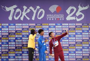 (250918) -- TOKIO, 18 septiembre, 2025 (Xinhua) -- El medallista de oro, Mattia Furlani (c), de Italia, el medallista de plata, Tajay Gayle (i), de Jamaica, y el medallista de bronce, Shi Yuhao, de China, posan para fotografías durante la ceremonia de premiación de la final de salto de longitud masculino, en el Campeonato Mundial de Atletismo 2025, en Tokio, Japón, el 18 de septiembre de 2025. (Xinhua/Li Gang) (rtg) (ra) (vf)