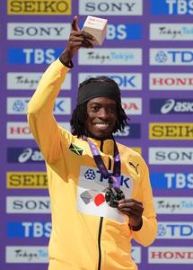 (250918) -- TOKIO, 18 septiembre, 2025 (Xinhua) -- El medallista de plata, Tajay Gayle, de Jamaica, posa para fotografías durante la ceremonia de premiación de la final de salto de longitud masculino, en el Campeonato Mundial de Atletismo 2025, en Tokio, Japón, el 18 de septiembre de 2025. (Xinhua/Li Gang) (rtg) (ra) (vf)