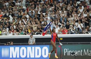 (250918) -- TOKIO, 18 septiembre, 2025 (Xinhua) -- Leyanis Pérez Hernández, de Cuba, festeja al término de la final de salto triple femenino, en el Campeonato Mundial de Atletismo 2025, en Tokio, Japón, el 18 de septiembre de 2025. (Xinhua/Wang Lili) (jg) (ah) (vf)