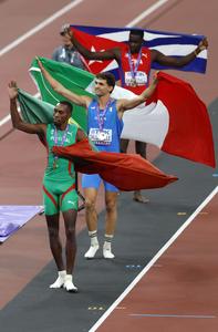 (250919) -- TOKIO, 19 septiembre, 2025 (Xinhua) -- Imagen del 18 de septiembre de 2025 del medallista de oro Pedro Pichardo (frente), de Portugal, el medallista de plata Andrea Dallavalle (c), de Italia, y el medallista de bronce Lázaro Martínez, de Cuba, festejando al término de la final de salto triple masculino en el Campeonato Mundial de Atletismo 2025, en Tokio, Japón. (Xinhua/Wang Lili) (rtg) (ra) (vf)