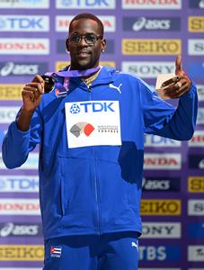 (250920) -- TOKIO, 20 septiembre, 2025 (Xinhua) -- El medallista de bronce, Lázaro Martínez, de Cuba, reacciona durante la ceremonia de premiación de salto triple masculino, en el Campeonato Mundial de Atletismo 2025, en Tokio, Japón, el 20 de septiembre de 2025. (Xinhua/Jiang Han) (oa) (ra) (ce)