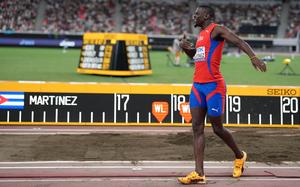 (250920) -- TOKIO, 20 septiembre, 2025 (Xinhua) -- Imagen del 19 de septiembre de 2025 de Lázaro Martínez, de Cuba, reaccionando durante la final de salto triple masculino, en el Campeonato Mundial de Atletismo 2025, en Tokio, Japón. (Xinhua/Ju Huanzong) (oa) (ra) (ce)