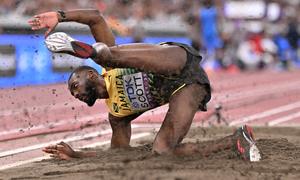 (250920) -- TOKIO, 20 septiembre, 2025 (Xinhua) -- Imagen del 19 de septiembre de 2025 de Jordan Scott, de Jamaica, compitiendo durante la final de salto triple masculino, en el Campeonato Mundial de Atletismo 2025, en Tokio, Japón. (Xinhua/Song Yanhua) (oa) (ra) (ce)
