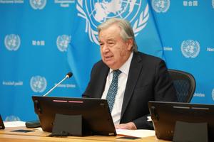 (250916) -- NACIONES UNIDAS, 16 septiembre, 2025 (Xinhua) -- El secretario general de la ONU, António Guterres, habla con la prensa en la sede de la ONU, en Nueva York, el 16 de septiembre de 2025. Guterres indicó el martes que las iniciativas globales propuestas por China son totalmente compatibles con la Carta de las Naciones Unidas. (Xinhua/Xie E) (jg) (ra) (ce)