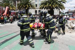 (250919) -- CIUDAD DE MEXICO, 19 septiembre, 2025 (Xinhua) -- Bomberos participan en el Segundo Simulacro Nacional, en la Ciudad de México, capital de México, el 19 de septiembre de 2025. Millones de mexicanos participaron el viernes en el Segundo Simulacro Nacional, realizado en el marco de la conmemoración de los sismos de 1985 y 2017, tragedias que dejaron cientos de fallecidos y marcaron profundamente la historia de México. (Xinhua/Francisco Cañedo) (fc) (oa) (ra) (vf)