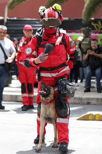 (250919) -- CIUDAD DE MEXICO, 19 septiembre, 2025 (Xinhua) -- Un elemento del Escuadrón de Rescate y Urgencias Médicas y su binomio canino participan en el Segundo Simulacro Nacional, en la Ciudad de México, capital de México, el 19 de septiembre de 2025. Millones de mexicanos participaron el viernes en el Segundo Simulacro Nacional, realizado en el marco de la conmemoración de los sismos de 1985 y 2017, tragedias que dejaron cientos de fallecidos y marcaron profundamente la historia de México. (Xinhua/Francisco Cañedo) (fc) (oa) (ra) (vf)
