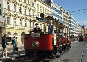 (250921) -- PRAGA, 21 septiembre, 2025 (Xinhua) -- Un tranvía histórico es visto durante un desfile de tranvías, en Praga, República Checa, el 21 de septiembre de 2025. Un desfile de tranvías se llevó a cabo aquí el domingo como parte de las celebraciones para conmemorar los 150 años del transporte público urbano en la capital checa. (Xinhua/Dana Kesnerova) (oa) (ah)