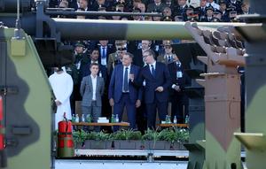 (250921) -- BELGRADO, 21 septiembre, 2025 (Xinhua) -- Imagen del 20 de septiembre de 2025 del presidente serbio, Aleksandar Vucic, asistiendo a un desfile militar conmemorando el Día de la Unidad, la Libertad y la Bandera Nacional de Serbia llevado a cabo, en Belgrado, Serbia. Serbia mostró su poderío militar el sábado con el desfile "Poder de la Unidad", llevado a cabo frente al Palacio de Serbia, marcando el Día de la Unidad, la Libertad y la Bandera Nacional de Serbia. De acuerdo con el Ministerio de Defensa, el desfile reunió a cerca de 10.000 elementos y presentó cerca de 2.500 piezas de armamento y equipamiento, incluyendo más de 600 vehículos, 70 aeronaves y 20 embarcaciones. (Xinhua/Predrag Milosavljevic) (rtg) (ah)