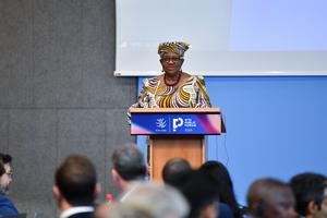 (250918) -- GINEBRA, 18 septiembre, 2025 (Xinhua) -- Imagen del 17 de septiembre de 2025 de la directora general de la Organización Mundial del Comercio (OMC), Ngozi Okonjo-Iweala, hablando durante la presentación de la edición 2025 del Informe sobre el Comercio Mundial, la publicación insignia de la OMC, en la sede de la OMC, en Ginebra, Suiza. La OMC dijo el miércoles que el uso de la inteligencia artificial (IA) podría impulsar el comercio mundial en casi un 40 por ciento para 2040, al tiempo que hizo hincapié en la necesidad de reducir la brecha digital. (Xinhua/Lian Yi) (jg) (ah) (vf)