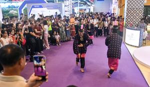 (250920) -- NANNING, 20 septiembre, 2025 (Xinhua) -- Visitantes observan una presentación malasia durante la 22ª Exposición China-ASEAN, en Nanning, en la región autónoma de la etnia zhuang de Guangxi, en el sur de China, el 20 de septiembre de 2025. La exposición abrió sus puertas al público el sábado. (Xinhua/Zhang Ailin) (jg) (rtg) (ce)