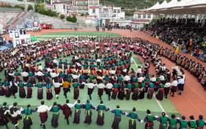 (250920) -- GANZI, 20 septiembre, 2025 (Xinhua) -- Vista aérea tomada con un dron el 20 de septiembre de 2025 de personas disfrutando de la danza Guozhuang, una danza circular tradicional tibetana, durante la ceremonia de inauguración de una semana cultural de blanqueamiento, en el distrito de Xiangcheng, en la prefectura autónoma tibetana de Ganzi, en la provincia de Sichuan, en el suroeste de China. Cada año, los lugareños blanquean las paredes exteriores siguiendo una tradición conocida como el ritual del blanqueamiento. (Xinhua/Jiang Hongjing) (jg) (rtg) (ce)