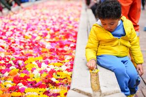 (250920) -- BOGOTA, 20 septiembre, 2025 (Xinhua) -- Un niño coloca una flor en la instalación floral "El Canto del Río" en el marco de la Bienal Internacional de Arte y Ciudad BOG25, en Bogotá, capital de Colombia, el 20 de septiembre de 2025. (Xinhua/Andrés Moreno) (am) (oa) (ra) (ce)