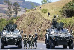(250922) -- IMBABURA, 22 septiembre, 2025 (Xinhua) -- Elementos del Ejército de Ecuador vigilan un bloqueo realizado por indígenas durante el paro nacional indefinido en rechazo a la reciente eliminación del subsidio al diésel, en la provincia de Imbabura, en el norte de Ecuador, el 22 de septiembre de 2025. El presidente de Ecuador, Daniel Noboa, afirmó el lunes que no cederá ante las presiones de ciertos grupos sociales que quieren desestabilizar el país, ante el paro nacional indefinido que inició el movimiento indígena en rechazo a la reciente eliminación del subsidio al diésel decretada por el Gobierno. (Xinhua/Ricardo Landeta) (rl) (oa) (ah) (vf)