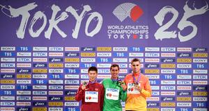 (250920) -- TOKIO, 20 septiembre, 2025 (Xinhua) -- El medallista de oro, Caio Bonfim (c), de Brasil, el medallista de plata, Wang Zhaozhao (i), de China, y el medallista de bronce, Paul McGrath, de España, posan durante la ceremonia de premiación del evento de 20km de marcha masculina, en el Campeonato Mundial de Atletismo 2025, en Tokio, Japón, el 20 de septiembre de 2025. (Xinhua/Jiang Han) (jg) (rtg) (ce)