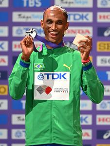 (250919) -- TOKIO, 19 septiembre, 2025 (Xinhua) -- El medallista de plata, Alison Dos Santos, de Brasil, reacciona durante la ceremonia de premiación de los 400m con vallas masculinos, en el Campeonato Mundial de Atletismo 2025, en Tokio, Japón, el 20 de septiembre de 2025. (Xinhua/Jiang Han) (oa) (ra) (ce)