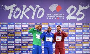 (250919) -- TOKIO, 19 septiembre, 2025 (Xinhua) -- El medallista de oro, Rai Benjamin (c), de Estados Unidos, el medallista de plata, Alison Dos Santos (i), de Brasil, y el medallista de bronce, Abderrahman Samba, de Qatar, posan durante la ceremonia de premiación de los 400m con vallas masculinos, en el Campeonato Mundial de Atletismo 2025, en Tokio, Japón, el 20 de septiembre de 2025. (Xinhua/Jiang Han) (oa) (ra) (ce)