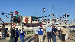 (250922) -- TRIPOLI, 22 septiembre, 2025 (Xinhua) -- Imagen del 21 de septiembre de 2025 de personas despidiéndose del buque Omar Al Mukhtar, en el puerto de Trípoli, Libia. El buque, que transporta ayuda humanitaria para el pueblo palestino, zarpó de aquí el domingo. (Xinhua/Hazem Turkia) (oa) (ah) (ce)