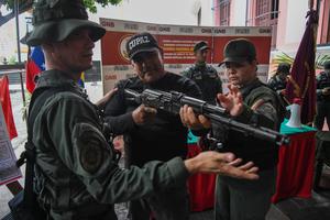 (250920) -- CARACAS, 20 septiembre, 2025 (Xinhua) -- Integrantes de la Fuerza Armada Nacional Bolivariana explican el uso de un fusil a un civil durante un ejercicio llevado a cabo en una plaza, en Caracas, Venezuela, el 20 de septiembre de 2025. Las fuerzas militares venezolanas desarrollan desde la mañana del sábado en todo el país, los ejercicios denominados "Los Cuarteles van al Pueblo", que forman parte de las operaciones de preparación en defensa de Venezuela. (Xinhua/Marcos Salgado) (ms) (jg) (rtg) (ce)